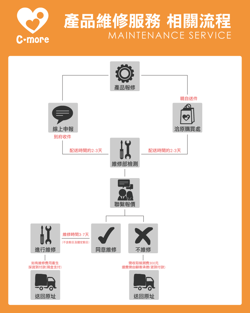 - 收到維修機器後,維修時間約3~7個工作天(不含物流配送、例假日及國定假日)。